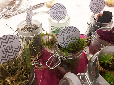 In das große Glas stellten wir ein Foto unserer Kinder mit einem Schild "Herzlichen Glückwunsch" und befüllten es mit Hackschnitzel und Hauswurz. Und zum Schluss noch ein kleiner DIY-Karten-Tipp. Unsere Glückwunschkarte wurde zu Hause gelassen und deshalb musste schnell eine Lösung her, damit sich das liebe Brautpaar auch am nächsten Tag noch erinnert, von wem dieses Geschenk ist. Wir nahmen unsere 4 Tischnamenskarten und banden sie mit einem Band zusammen. Dazu ein kleiner Text und schon ist sie fertig, die wohl schnellste Hochzeitsglückwunschkarte der Welt.